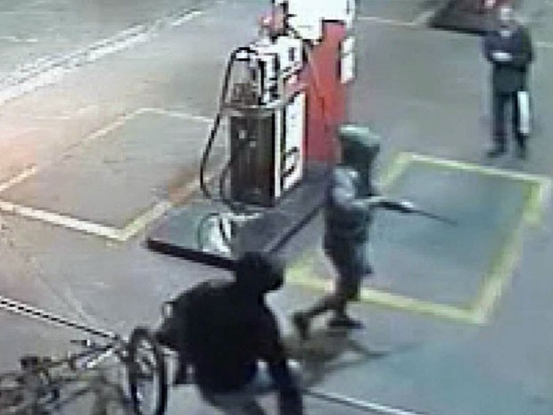 Nas imagens, é possível ver que os dois rapazes chegam encapuzados e jogam a bicicleta no chão. Um deles, armado com uma espingarda, rende um funcionário de imediato. No caixa, ele mantém a arma apontada para as vítimas enquanto o outro assaltante recolhe o dinheiro, cerca de R$ 4,2 mil, que estavam em um malote. Em seguida, os criminosos ainda roubam a carteira do funcionário do posto.