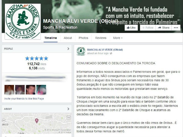 A torcida organizada do Palmeiras, Mancha Alvi Verde, comunicou nesta sexta-feira (25) que não vai alugar ônibus para os torcedores chegarem até a Arena Corinthians, na Zona Leste de São Paulo, para o jogo contra o rival neste domingo (27) e que deve seguir ao estádio usando o Metrô.